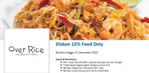 Nikmati diskon 15% dengan menggunakan kartu kredit BCA di Over Rice Resto. Promo berlaku Hingga 31 Desember 2015.