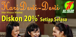 Datang ke Es Teler 77 dan nikmati promo Hari Dewi-Dewi diskon 20% Khusus para wanita, pas banget buat makan siang bareng teman atau keluarga Anda