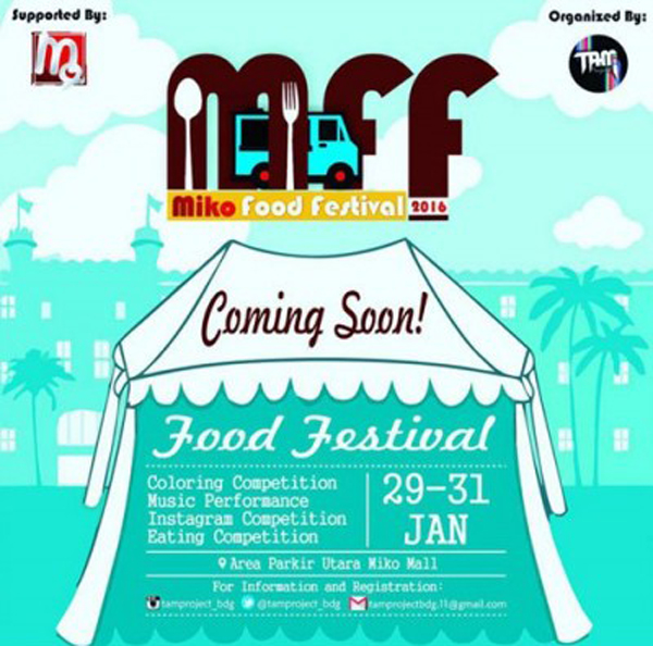 Ada event seru buat anda yang suka dengan kuliner. Pada 29-31 Januari 2016, di Area Parkir Utara Miko Mall Bandung, Anda bisa menemukan Food Festival yang menyediakan beragam jajanan khas nusantara dan internasional.