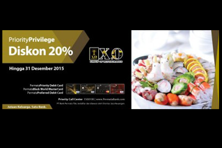 Nikmati diskon 20% di XO Restaurant dengan menggunakan kartu kredit Bank Permata. Promo berlaku hingga 31 Desember 2015