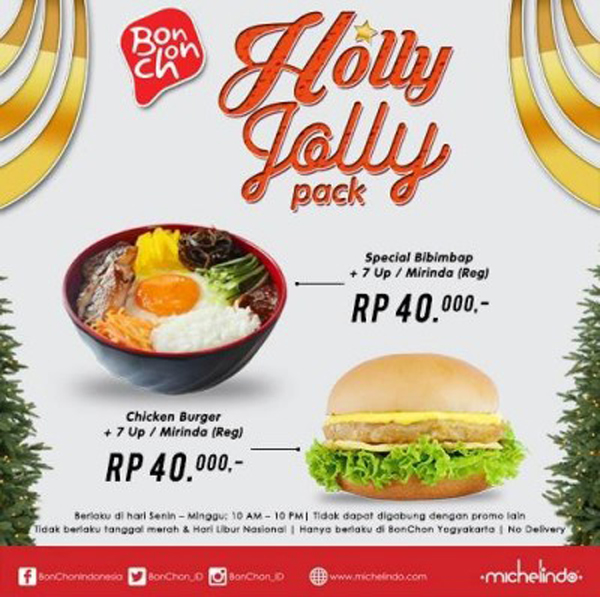 Kunjungi Bonchon resto dan nikmati menu baru BonChon: Holly Jolly Pack! Nikmati Special Bibimbap + 7 Up/Mirinda & Chicken Burger + 7 Up/Mirinda cuma Rp 40.000.