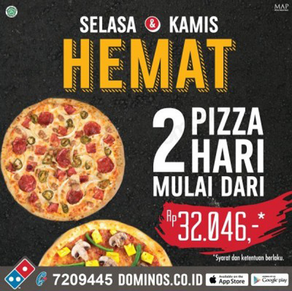 Setiap hari selasa dan kamis di Domino's Pizza, beli 2 pizza mulai dari Rp. 32.046 saja