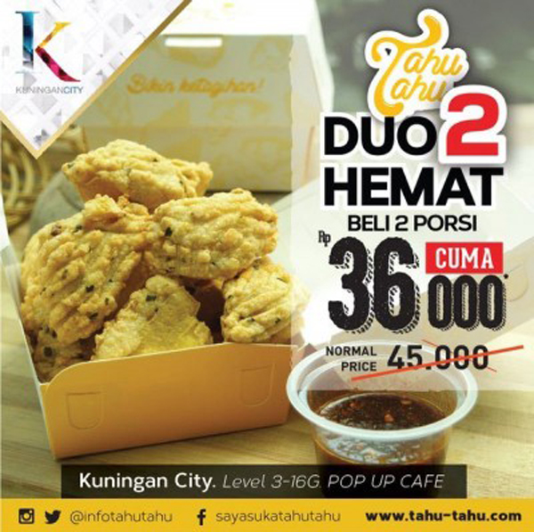 Harga promo duo hemat dari Tahutahu, Kuningan City. Beli 2 porsi kini hanya Rp36.000. (harga normal Rp. 45.000,-) Lebih hemat.