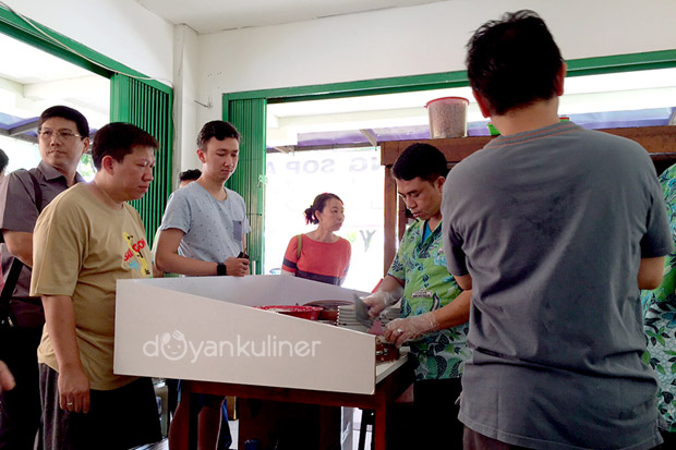 Nasi yang saya pesan ditaburi dengan bawang goreng menambah rasa gurih jika disiram dengan kuah sop. Pas juga dipadukan dengan tempe gorengnya yang memang disediakan di tiap meja. Ternyata memang nggak hanya aromanya yang nikmat tapi juga rasanya. Walau sajiannya terlihat sederhana, rasanya justru luar biasa. Nggak heran jika pukul 11.30 makanan ini sudah habis dan selalu laris manis tiap harinya. (Avellia)