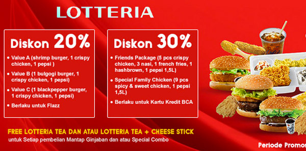 Mau diskon sampai 30% + free lotteria tea dan lotteria tea+cheese stick? Buruan datang ke Lotteria yuk, bawa kartu kredit BCA anda ya :).