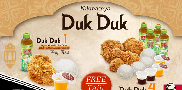 Bingung mau berbuka puasa nanti dimana? Ke KFC aja dan nikmati 2 pilihan paket duk duk: Duk Duk 1 Rp31.818 dan Duk Duk 4 Rp116.364. Gratis tajil