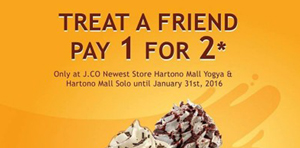 Nikmati promo Pay 1 For 2 di J.CO! Promo ini hanya berlaku di store J.CO Hartono Mall Yogya, J.CO Hartono Mall Solo & J.CO The Park Solo
