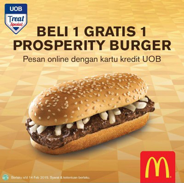 Nikmati promo Prosperity Burger di McDOnalds. Beli 1 Gratis 1 dengan menggunakan kartu kredit UOB, promo berlaku hingga 14 Februari 2016