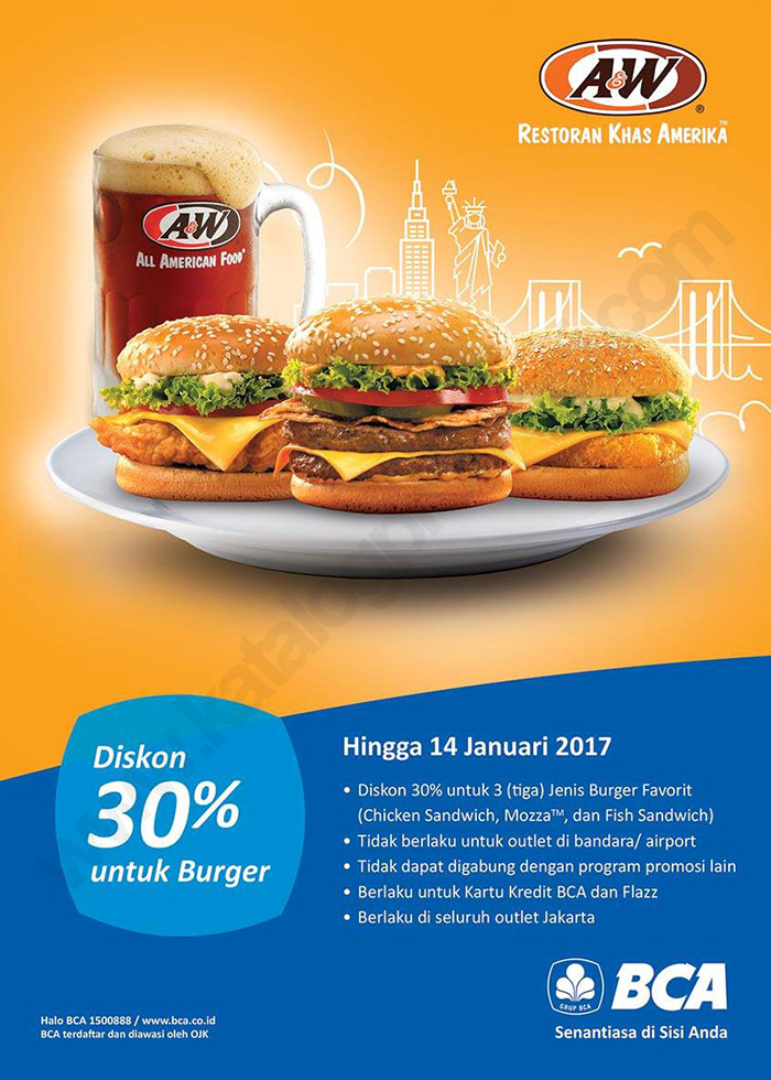 Kini telah hadir Discount 30% untuk Burger (Mozza, Chicken Sandwich, Fish Sandwich) bagi pengguna kartu kredit BCA dan Flazz, berlaku di semua store A&W di Jakarta kecuali di bandara.