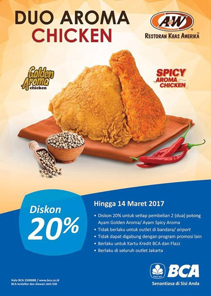 Ada kabar baik nih untuk kalian. Dapatkan Diskon 20% bagi kamu yang membeli 1 set Duo Aroma Chicken (1 Golden Aroma Chicken + 1 Spicy Aroma Chicken) dengan menggunakan kartu kredit atau Flazz BCA. Promo ini akan berlangsung sampai dengan 14 Maret 2017. Ayo datang ke Store A&W terdekat! (tidak berlaku untuk Store A&W di Bandara)