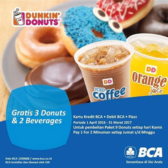 Gunakna terus kartu kredit, kartu debit atau kartu flazz BCA anda saat santap menu favorit di Dunkin Donuts. nikmati promo beli 1 gratis 1 khusus untuk pembelian menu minuman. promosi berlaku sampai 31 maret 2017.